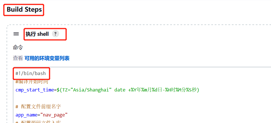 - 定位原因 我搜索 jenkins bash 脚本报错的原因,发现有人说是 dash 和 bash 的问题。我用编译时报错的语法检测了jenkins和主机的情况,确认都是 bash 环境,那么真相只有一个!jenkins 有坑!于是,我在 Jenkins shell 编译脚本输入框的最前面加上了 “#!/bin/bash” ,强制指定为 bash 环境运行,编译过了!!!